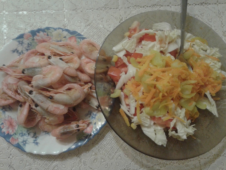 Ужин: салат с айсбергом, помидором, тушеной тертой морковью и перцем зеленым+ креветки вареные. масло оливковое.