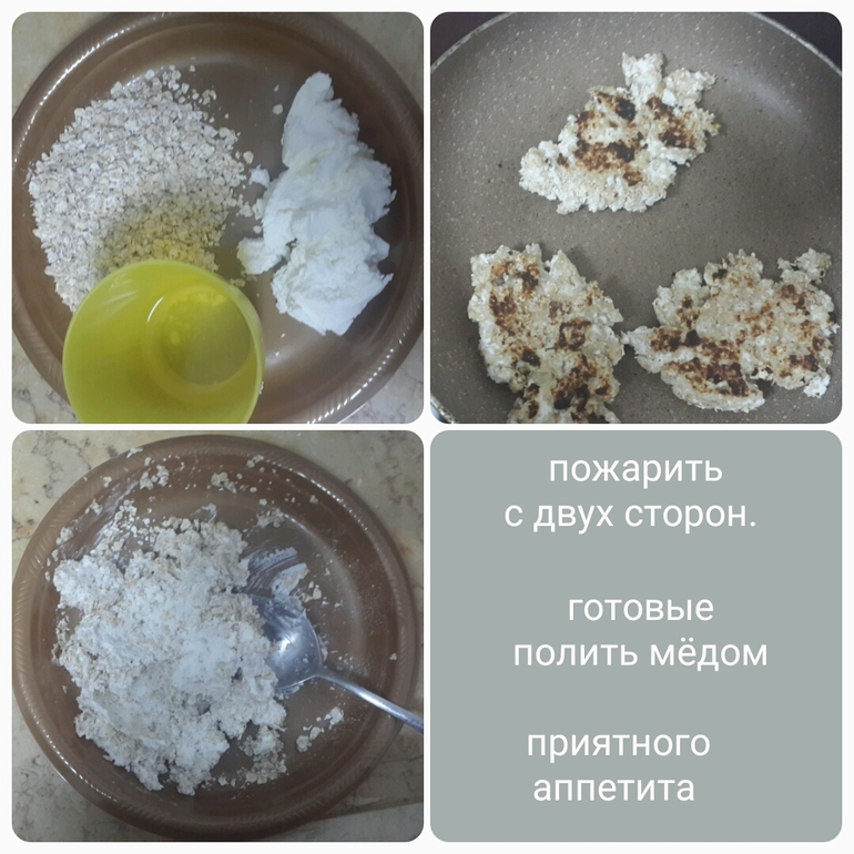 гость овсянки, немного творога и немного воды - перемешать и жарить на сухой сковородке - получаются вкусные оладушки к кофе.... готовые поливаю мёдом....
