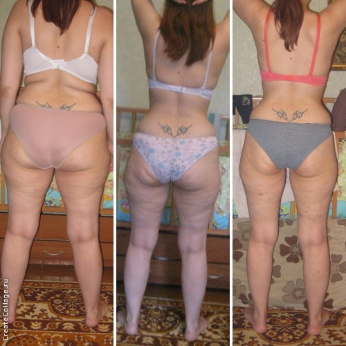 При весе 66 кг (так как только спорт и антицеллюлитный крем не помогал) к борьбе с целлюлитом (а его вылезло ОООчень много) подключила массаж скалкой и контрастный душ. Прикладываю результаты на сегодняшний день. На синяки прошу не обращать внимания