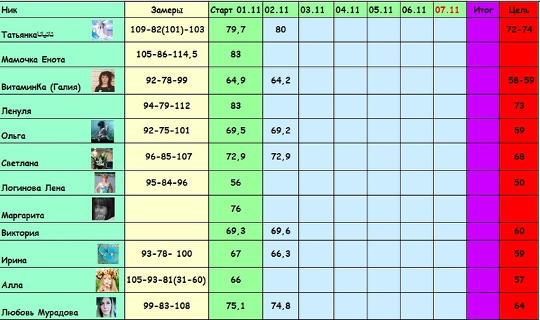 напишите цель для таблички....пропустила вопрос))) меню да за 02.11 а вес утро 03.11 тут я писала СТАРТ "Марафон по Системе -60" 1 день