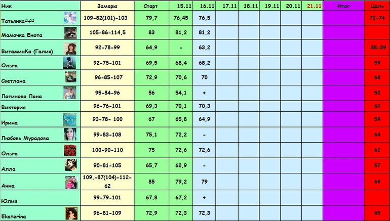 Я на 2 дня выпала из системы, да и так, даже отчёт вчера не смогла отправить - позавчера собиралась в дорогу, убиралась, вчера 12 часов в дороге, уехала из города к своим родителям, пока тепло, да и мужа все равно до НГ не будет. Весы с собой взяла - 71.6! А питалась как попало( С сегодня снова в строю худеющих