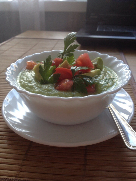 Второй - просто бульон на индюшачьей голени, с фрикадельками. Третий - суп-пюре из авокадо - очень необычное приятное блюдо, но это все-таки не суп:)))в традиционном смысле:) пюрируем авокадо, свежий помидор, вареный лук(2 шт) и сельдерей. Добавляем лимонный сок и до необходимой консистенции любого бульона по вкусу. Соль перец - по вкусу. Но по рецепту должен быть кайенский перец, ибо это острый суп:)