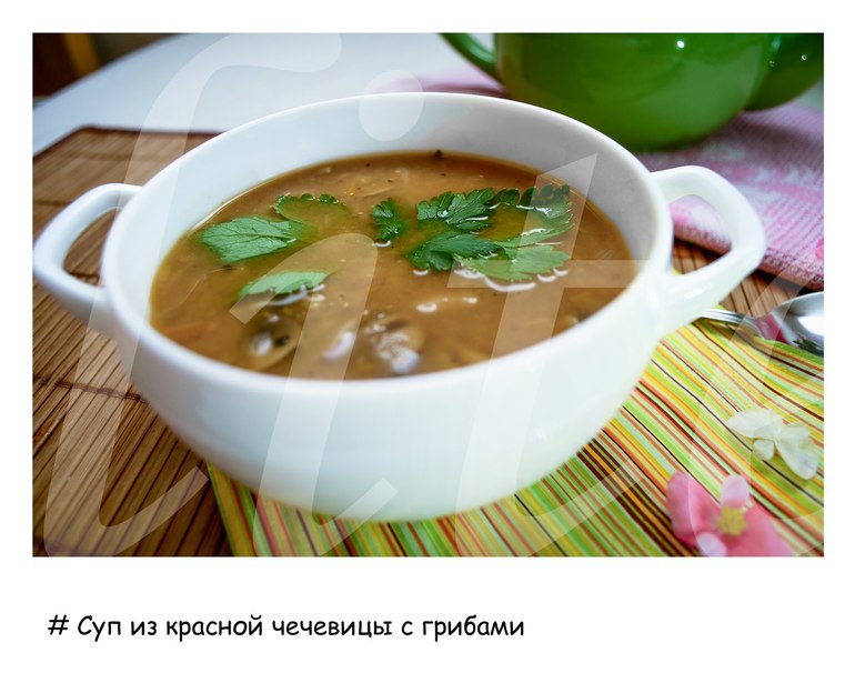 Ничего особенного. Специи по вкусу, на стакан чечевицы 2,5 стакана воды и готовится на медленном огне до нужной консистенции - кому-то нравится крупинками - кому-то суп-пюре. Лучок, грибочки, томатную пасту в зависимости от того, носколько хотите сэкономить на калориях - или пожарить или добавить в кипящую воду