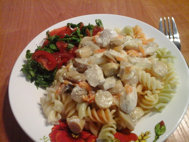 Это каша/макароны из ТСП + кура/рыба + свежие овощи