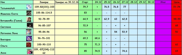Посмотрите на табличку, 30 числа будем снимать замеры и вес, не важно + у вас или - напишите )))) чтоб нам закончить марафон нормально