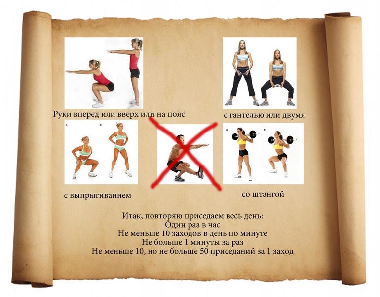 Варианты приседов любые, можно делать какой-то 1 вид, можно чередовать.