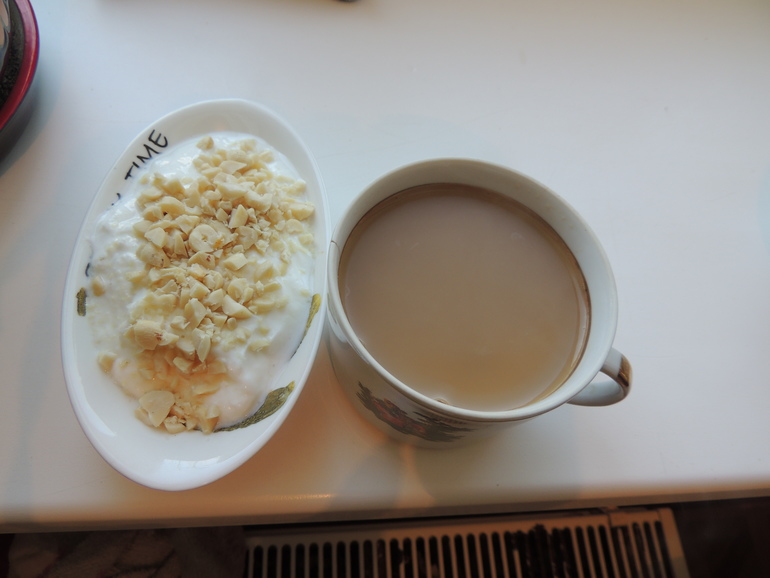 2.Перекус-творжок 0,02%+арахис 10гр +кофе с молоком(пью только до обеда с сахаром)