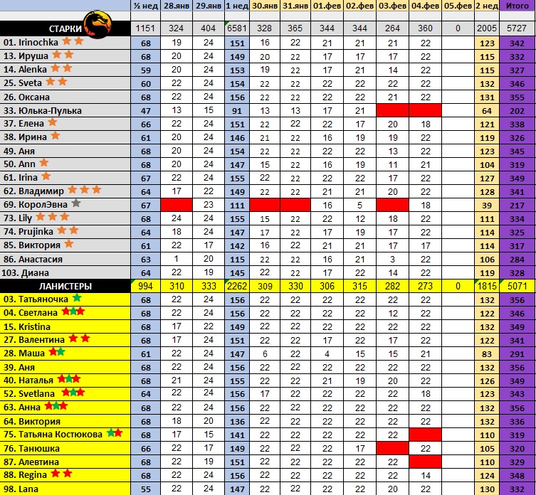 98 Ланистер Пп- 12 джокер - 0 спорт - 5 (шон фокус) уход - 1 (крем) бонус - 2 итого 20