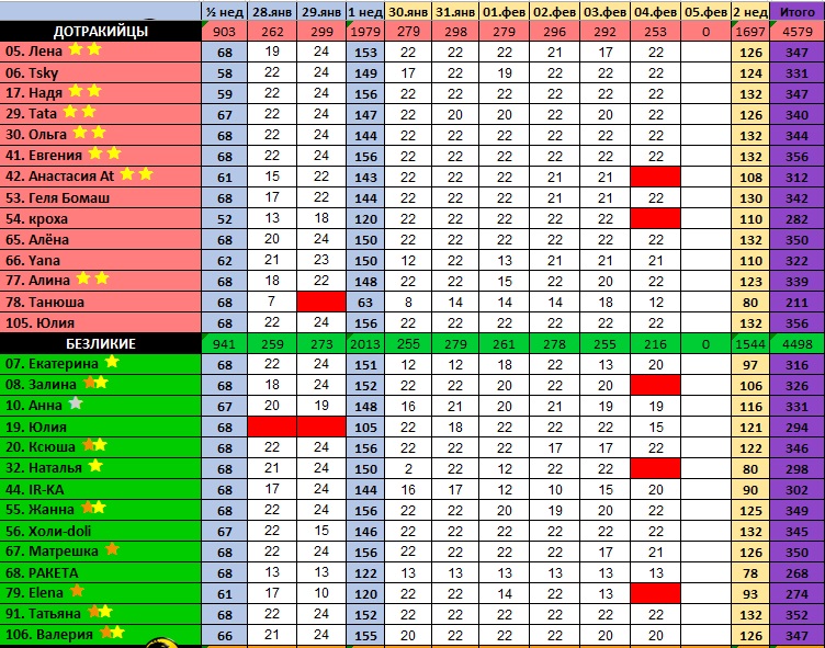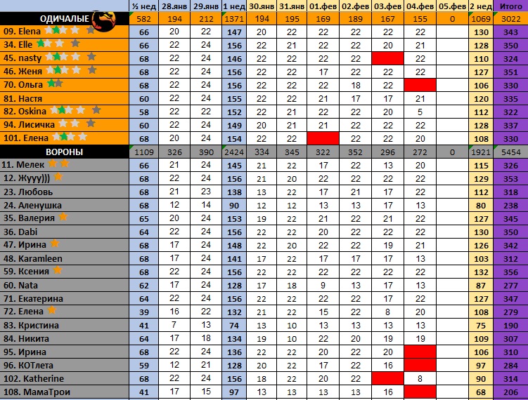 29 дотракийка пп - 12 Спорт - 5 (растяжка Шона Вига) ДЖокер - 4 Уход - 1 (спрей увл) Бонус за сладкое - 2 Итого 24