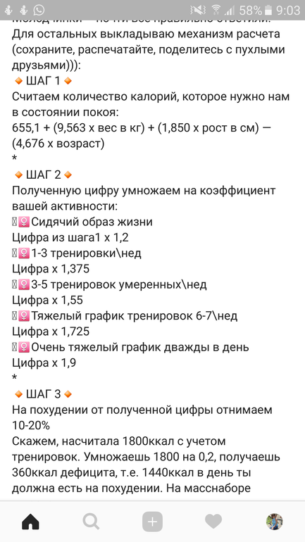 Блин, тупанула я... Там в конце минус, а я плюсовала. Пересчитала, выходит 1756.931 без учета гв. Читаю, что на лактацию тратится в день 500-600 ккал, но я не кормлю в том объеме, как раньше. Пусть будет 200-300 ккал. Получается 1956-2056 ккал моих затрат в день. Значит, для похудения -250-300=1750-1800 ккал. Попробую придерживаться это цифры. Спасибо!