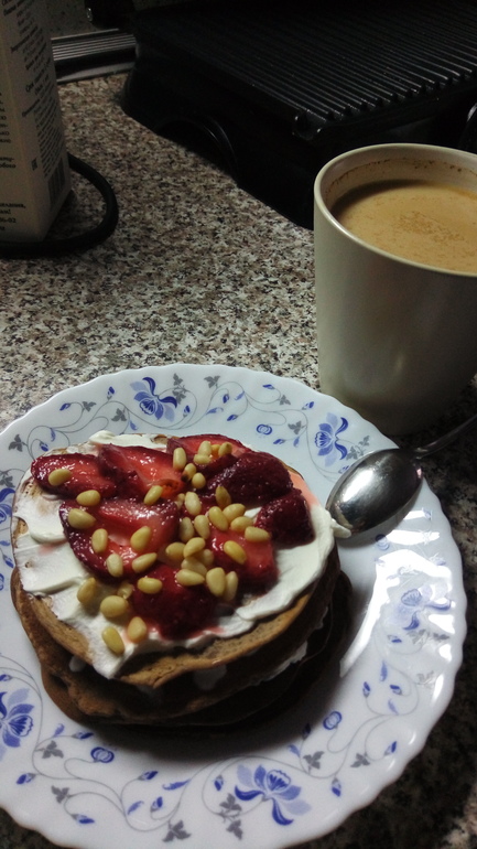 Спасибо. Это овсяноблин,только с какао. 3 перепелиных яйца, молоко, вода 50/50, заменитель сахара фрит, какао, мука овсяная. Между слоями творожный крем, клубника и один круг мороженого.