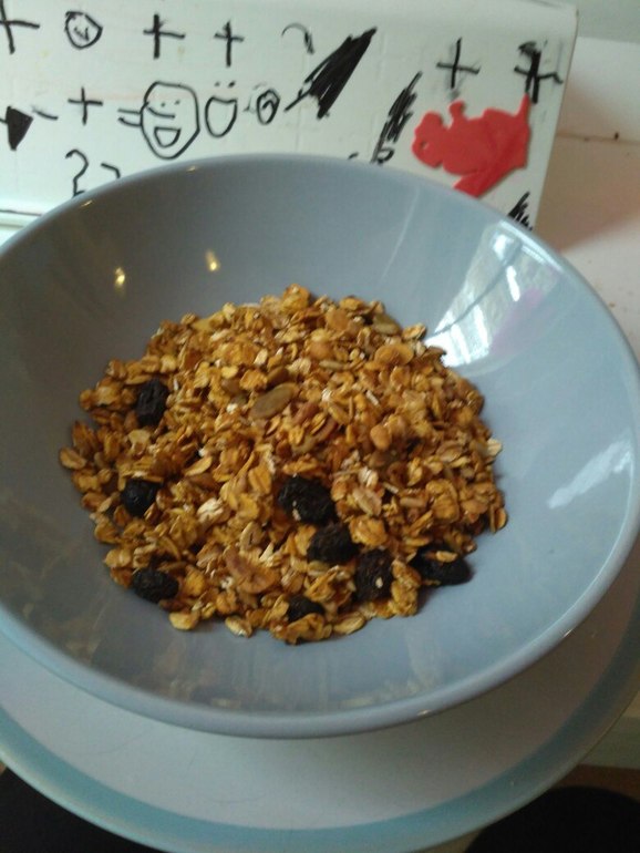 вчера вечером делала Завтрак на сегодня - гранолу, побежала в Зал, оставив в духовке, поэтому изюм сгорел, и она вышла немного более румяная, чем надо) Мешаете овсянку, семечки, орехи, ягоды (450 гр где-то всего), куркуму и корицу, взбиваете 2 белка и перемешиваете, выпекаете час на 200 градусах, помешивая. Я специально не добавляю сиропов, ем без них, но если надо, то можно полить медом чуть-чуть (хотя я лично сомневаюсь в пользе меда, к тому же его нельзя нагревать).