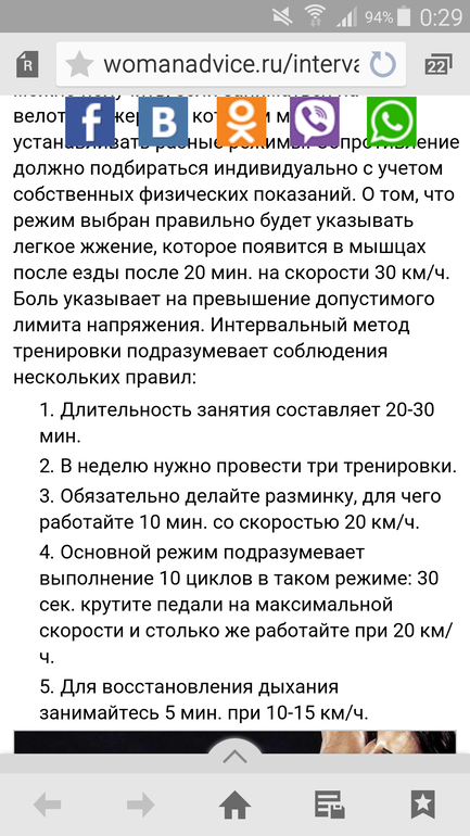 Что касается езды на скорости 30 км/ч, да еще и 20 минут и "при этом вы будете ощущать легкое жжение", это бред. Попробуйте - вы убьетесь, даже если сможете поддерживать данную скорость хотя бы 2 минуты. Средняя скорость 30 км/ч не доступна для людей, слабо увлекающихся велосипедом. В любом случае, 20 минут такой нагрузки можно проводить не чаще раза в неделю, это очень вредно для сердца.