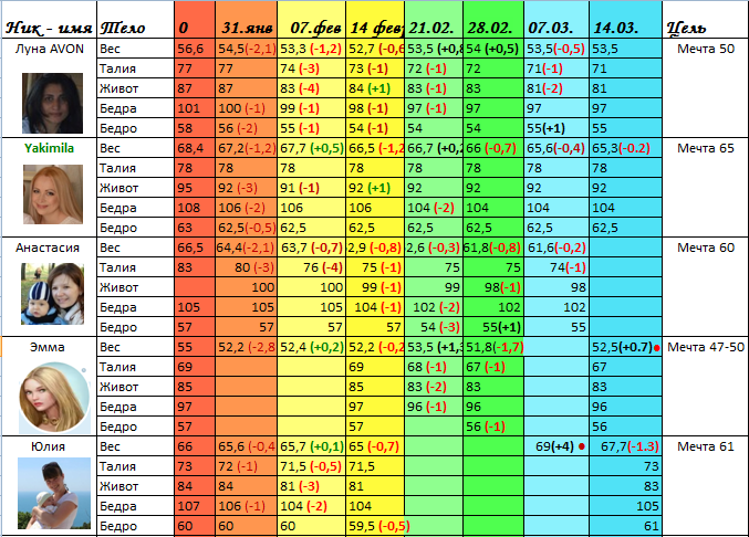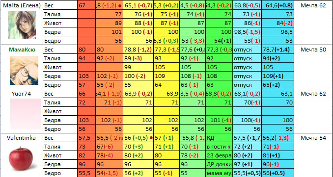 Интересная картина у Юли (Yuar74)? талия почти не меняется, хотя скинула она в общей массе уже 3 кг. И ноги тоже. Юля? В чем подвох?:)))