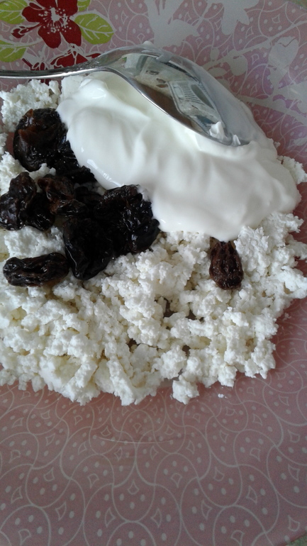 На ужин у меня был творог 2% с 1 ст. ложкой сметаны, 2 штуки чернослива, и 1 чайная ложка изюма, зеленый чай.