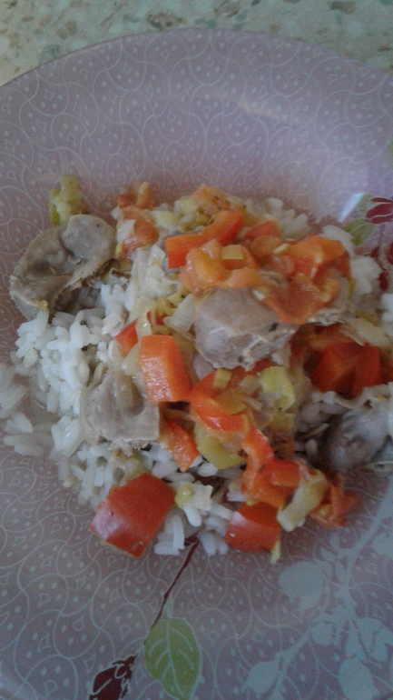Потом там же немного обжарить кур. желудочки, потом добавить порезанные кубиками два помидора и один крупный красный болгарский перец.