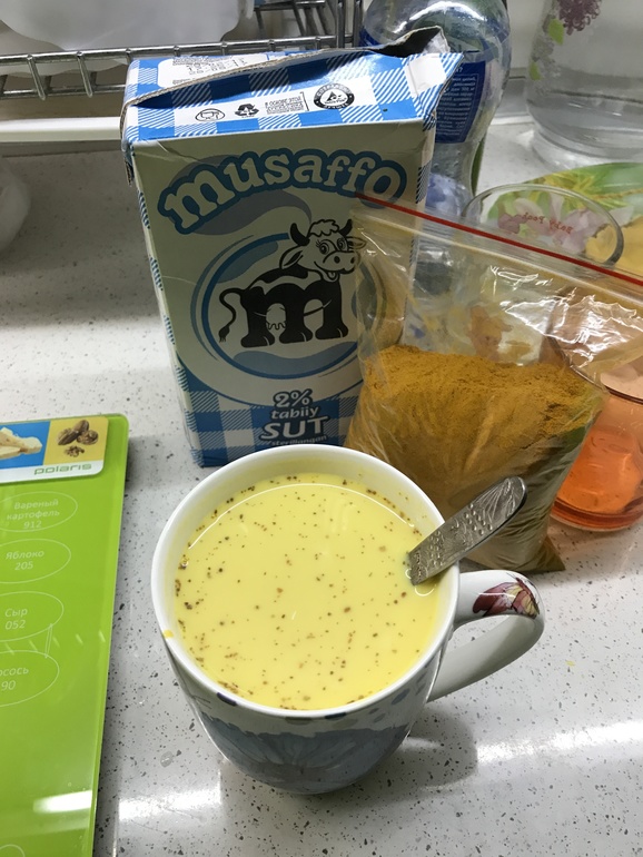 Напиток носит название «золотой» из-за своего янтарного оттенка. Чтобы его приготовить необходимо залить 1 ст. л. куркумы 80 мл кипятка (в чашке или стакане), добавить мед по вкусу, тщательно размешать. Заполнить посуду до краев молоком. Можно подогреть или пить холодным. Лучше принимать на ночь.