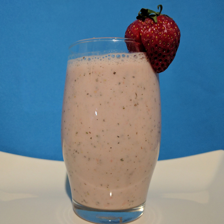 Взблендерить банан, клубнику и мяту с небольшим добавлением воды или кефира. Затем добавить кефир и опять взблендерить.
