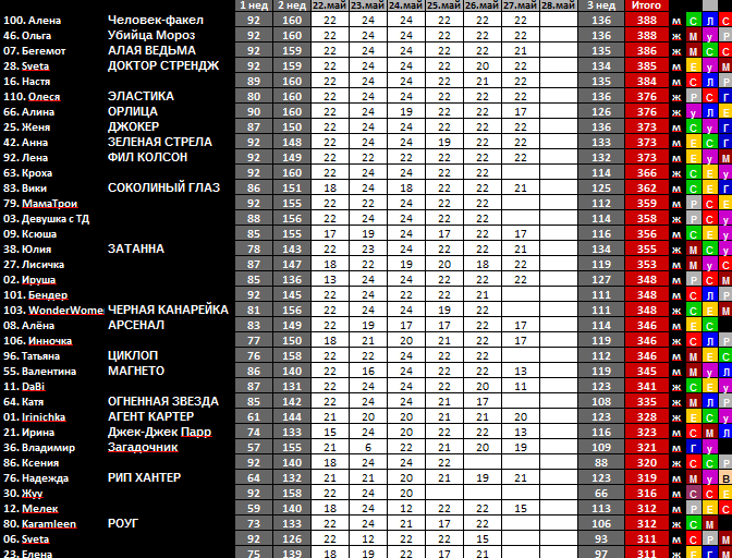 Воскресенье 28.05: ПП 12, бонус за стойкость 2 (ура!), спорт 1 (утренний комплекс с Корпан) и уход 1 (массаж). Итого 16 баллов