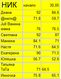 Привет, девочки. Вот и подошло наше последнее взвешивание. Жду от вас показания, таблицу завтра смотреть можно будет в этом же посте.