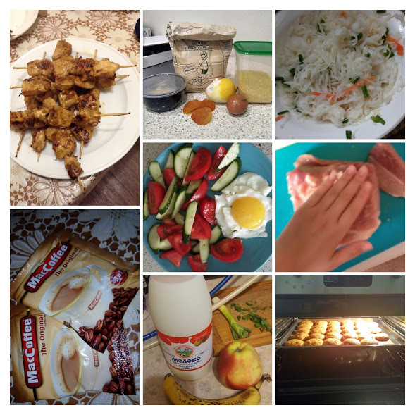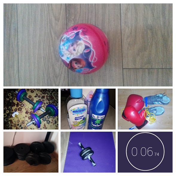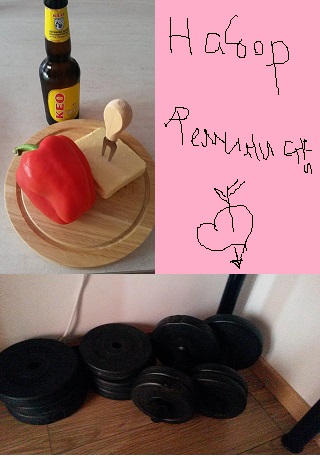 курица, лимон, огурец, сыр, помидоры, печенье, яйца, какой-то миксованный напиток, бананы, горошек, морковь, мясо, перец, капуста, яблоки, кофе, пиво, пузырьки с чем-то косметическим, яромасвечи, йогоковрик, тяжелая гантеля, фитбол или мяч, кеды и секундомер, перчатки, средние гантели, скакалка..