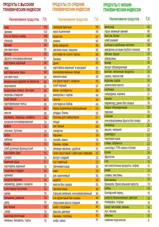 Ниже приведу таблицы продуктов с низким, высоким и средним ГИ. Сама буду употреблять в пищу на протяжении магафона углеводы с низким ГИ.