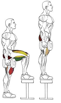 Держите гантели хватом сверху. Руки опущены, ладони обращены к туловищу. Согните руки в локтях до уровня плеч. Это исходное положение.