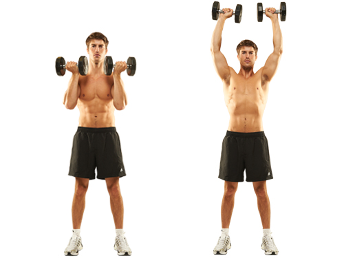 Согните руки в локтях в направлении груди, разверните ладони вперед, выжмите гантели вверх. Выполняйте всё одним плавным движением.