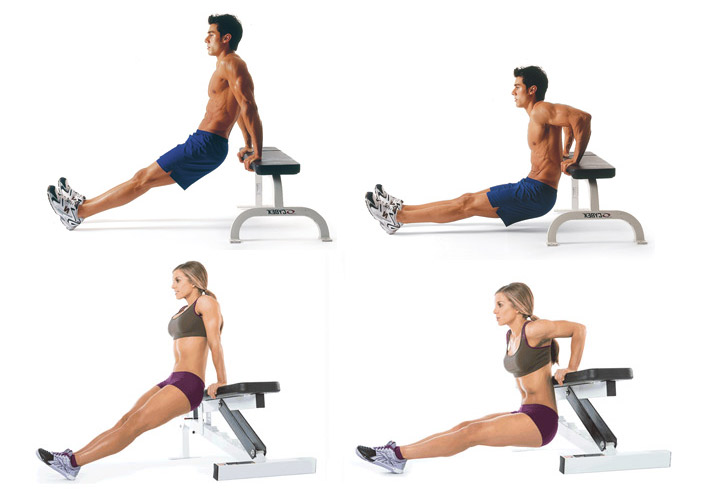 Медленно сгибайте руки в локтях, опуская туловище между брусьев до тех пор, пока плечи не примут положение параллельное полу. Напрягая трицепсы и мышцы груди, разгибайте руки, пока не вернетесь в исходное положение. Повторите упражнение.