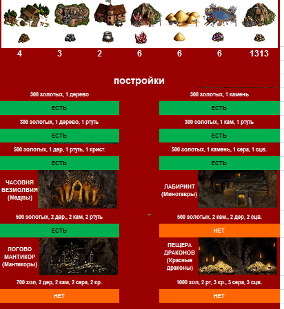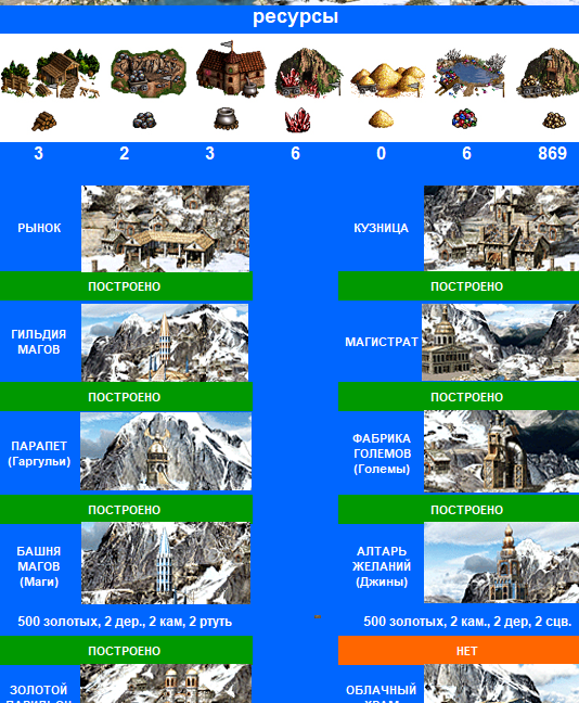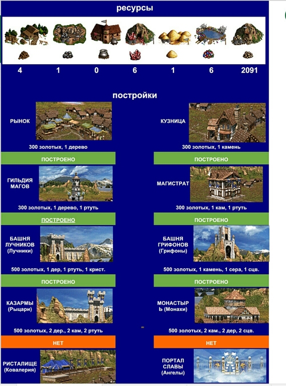 Некрополь ухватил голубку удачи (+5 бонусных баллов), изучил заклинание ВИденье и волшебную мишень. И ждет +1 рандомный ресурс от Бендера за Мельницу) Завтра план такой. Ч7>Ш7>Ш6>Ч6>Ц6 бег-сера-бег-самоцветы, т.к нужны ресурсы горшки ртути, сера и самоцветы для будущих строек. Отчет