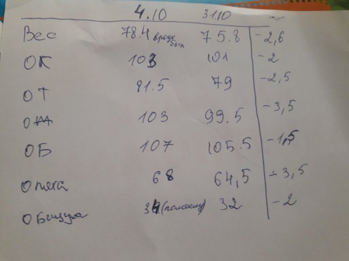 На сегодняшнее утро мой вес составляет 75.4 вчера сделала замеры и сравнила их с замерами на начало месяца