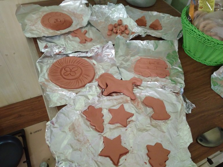 Погода отстой, зато вчера мы лепили игрушки и магнитики к новому году из керанопласта.