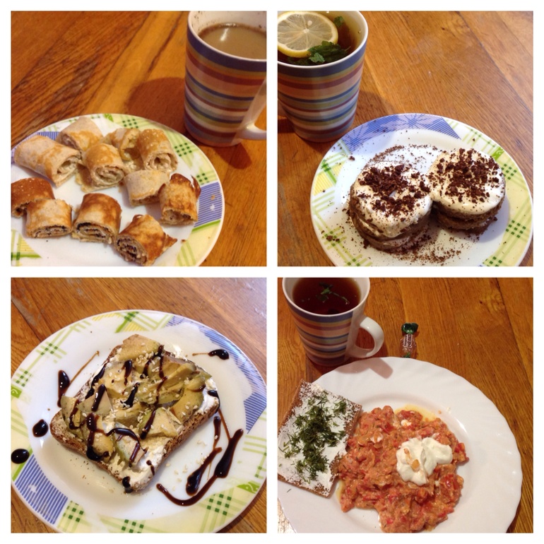 1. Две половинки овсяблина: одна со сливочным сыром и икрой, второй - со сливочным сыром и маком, кофе с молоком, шоколад 1 долька
