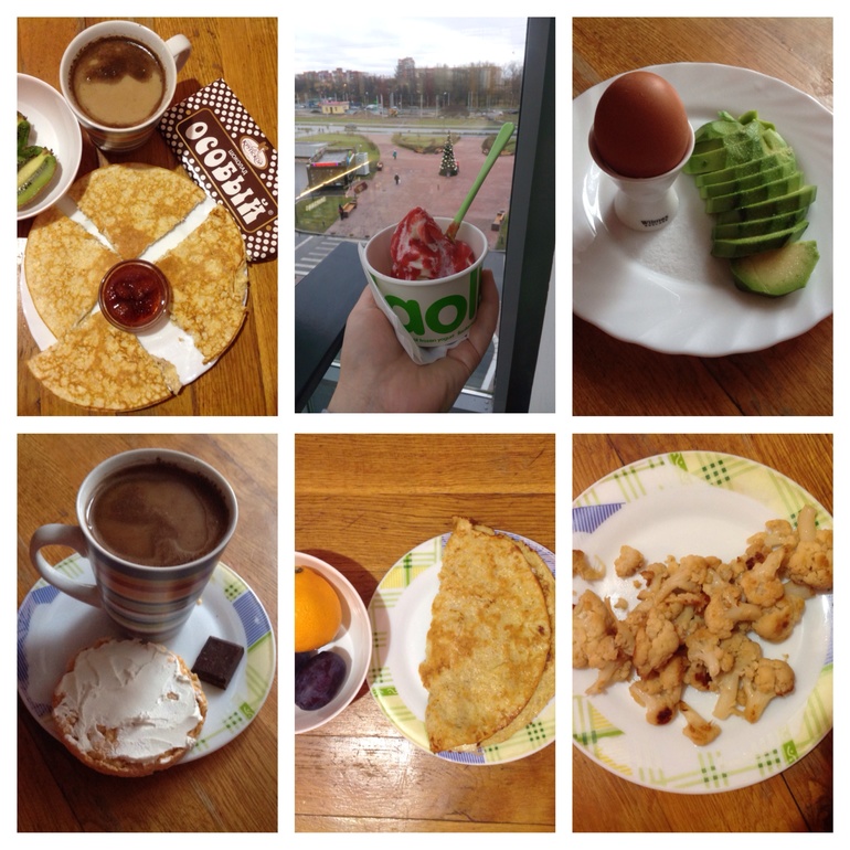 3. Яйцо всмятку (потом еще одно съела, одним не наелась), половинка авокадо, кофе с молоком, карамельный хлебец со сливочным сыром СЫРКО