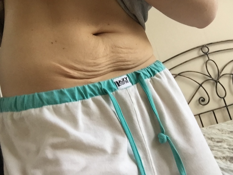 У меня кожа живота не вернулась в исходное состояние после родов и сброса веса (-19 кг), с полусогнутым корпусом живот выглядит так: