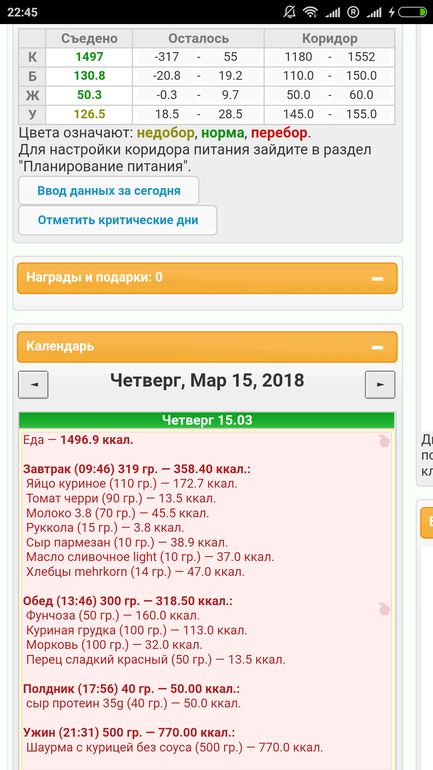 Доброй ночи) итак, вроде вхожу в режим, хотя меню у меня однообразное, Но мне так удобнее, проще считать, меню вышло как и вчера)) У: яичница с помидором и горошком, кофе с молоком, крабовые палочки , день: грудка, гречка, соус; кукуруза, вечер: помело, цветная капуста, кукуруза, грудка индейки, кофе с молоком. 1592 ккал. Сегодня еще спорт был 40 мин кардио, 30 мин силовых.