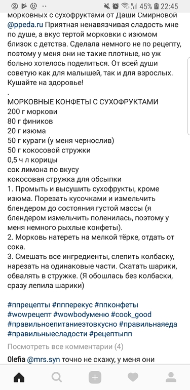 Во-2. Тут есть неочевидный, но опасный момент. Когда человек просит ПП рецепты, у него обычно выключается тревожный звонок. ПП рецепт воспринимается как некоторая свобода, ненаказуемая при этом. И когда вам в руки попадают псевдо ПП рецепты подобных "наполеонов", вы имеете абсолютно неиллюзорные шансы наесть с ними столько, сколько не наели бы, если бы взяли обычный "наполеон", но ваш тревожный звонок - что это продукт все-таки запрещенный, и поэтому можно чуть-чуть - сработал бы вовремя. Это же касается и предложенных вам конфет из сухофруктов - бешеная углеводная бомба, по содержанию сахара они ничем не уступают обычным конфетам. Кусок горького шоколада и то будет полезнее.