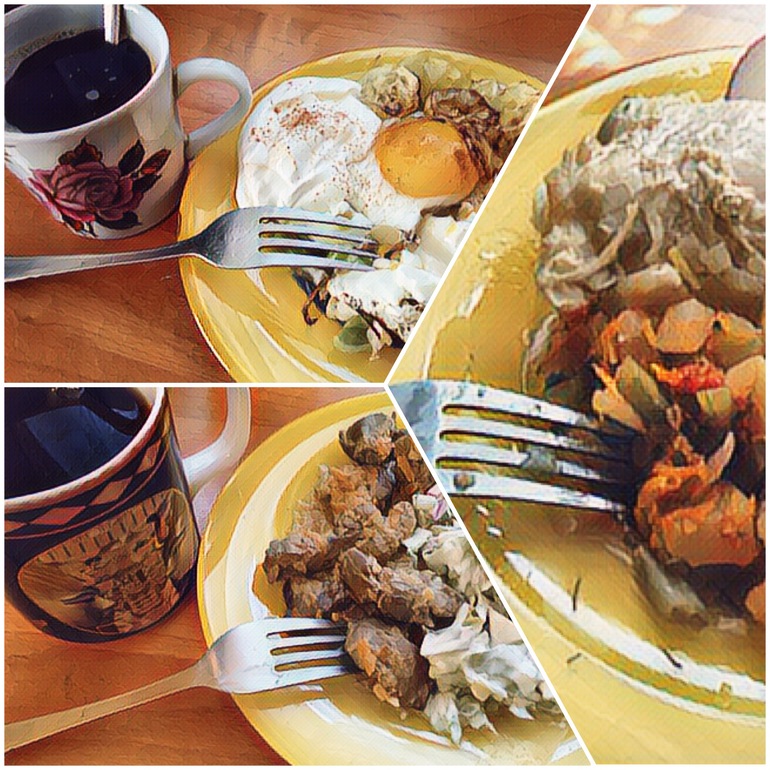 Ужин - куриная печень в сметане, овощной салат (редис, зелень, сметана). Кофе