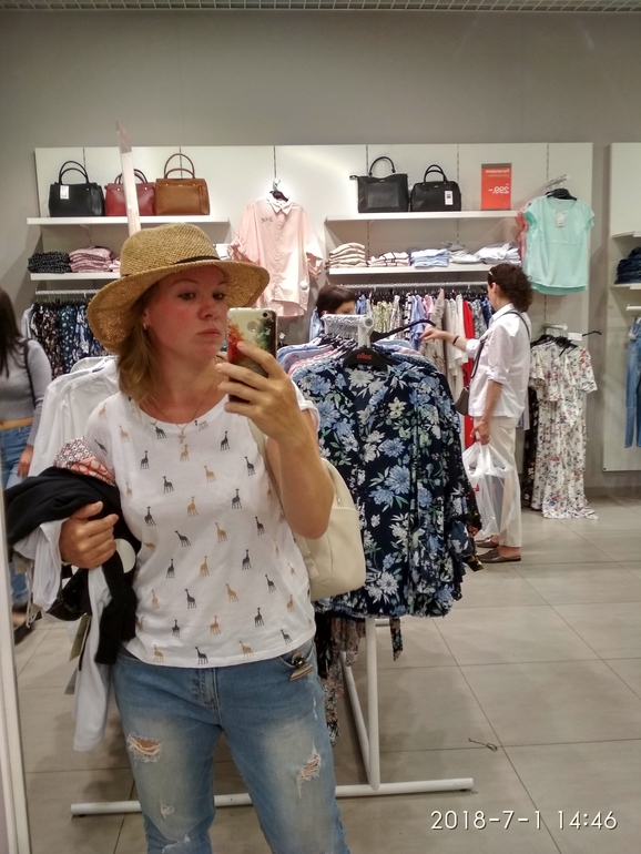 Оль, футболку или майку любого цвета, что есть на рубашке. Я там увидела зеленый, розовый, желтый. Полоска мне видится серой или голубоватой. Но вот желтый и зеленый может быть трудно найти подходящего твоему цветотипу цвета. Поэтому ищи белый (я знаю, что ты его любишь), пыльную розу, голубовато-серый, голубой. Эта с жирафами не подходит, но ты и сама знаешь. Принты спорят - цветочный и анималистичный.