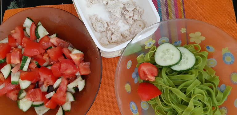 Днём суп овощной+говядина+салат овощной+ паста со шпинатом.