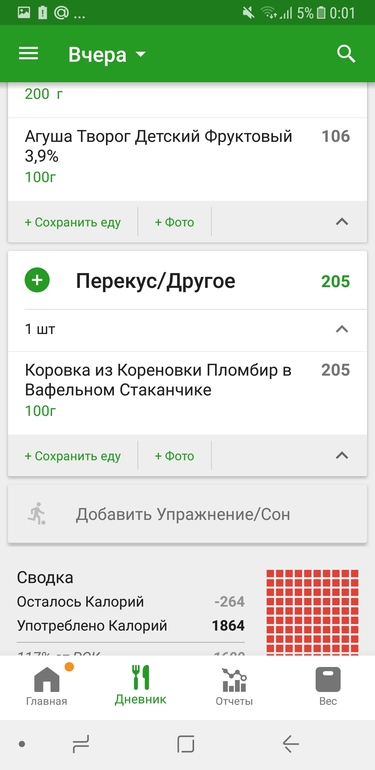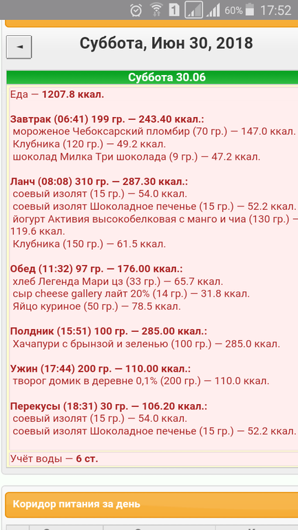 Питание лучше, но перебор с перекусом, мороженое было лишним. Завтра серьезно поработаю над тем как вписать его в рацион без потерь для белка и калорий.