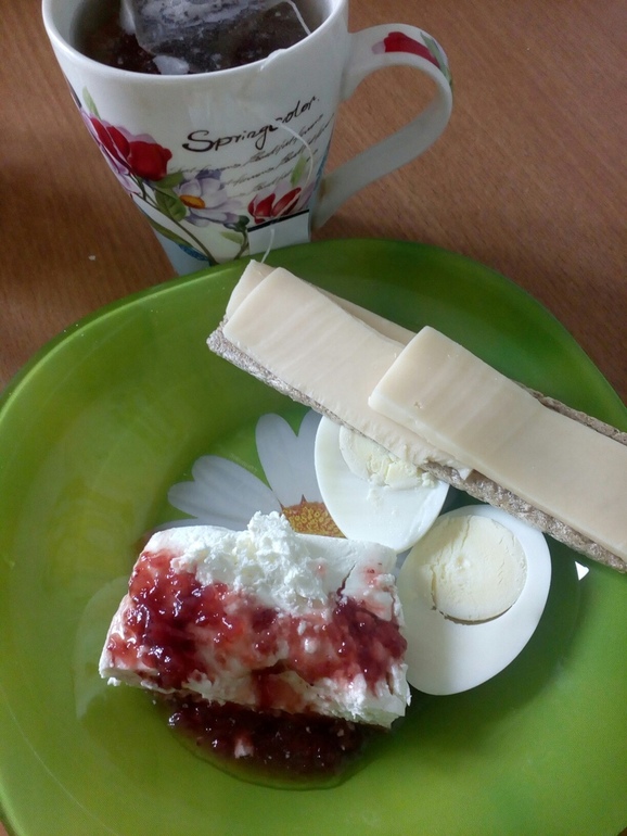 Завтрак: варёное яйцо, хлебец с сыром и попробовала творог с клубничным вареньем (это из разряда "люди в сметану и я не отстану"