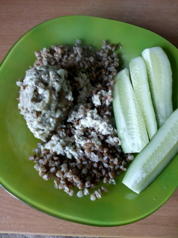 Обед: запаренная гречка и духовая тефтеля с яйцом, огурец. Кусок хлеба. Чай б/с.
