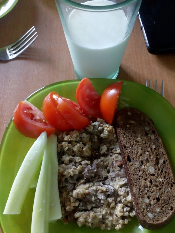 Обед: ячневая каша, тушеная с куриной печенью в сметане. Кусок хлеба с семечками. Молоко