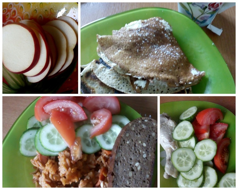 Обед: борщ. Ужин тоже борщ( наготовила с утра, чтоб поехать в город). Перекусы: клубника, сливы, вода.