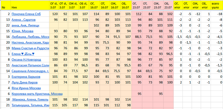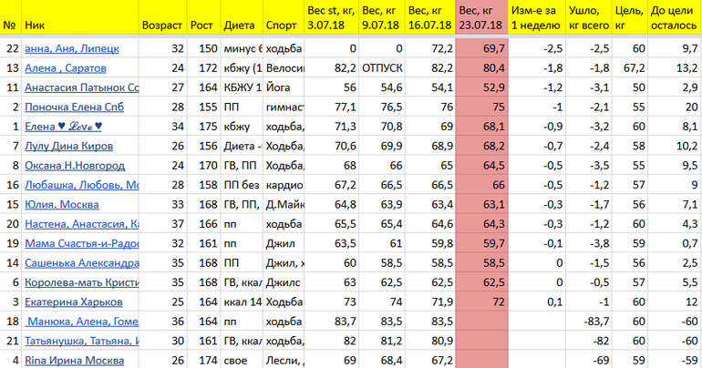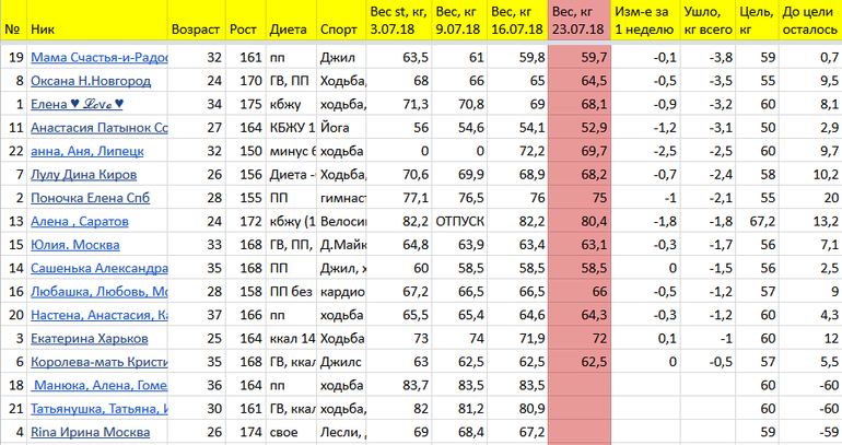 Стройнеем вместе(здесь пишем марафоны,которые уже идут, или предложения о марафоне)Сегодня ровно 3 недели, как у вас дела? Довольны результатом за 3 недели? Подведем итоги, всего скинуто за неделю 9,7 кг, за 20 дней ушло 29,5 кг и потеряли 54,5 см за неделю. Лидер диеты - минус 60 и подсчет калорий. Лидер спорта - ходьба с Лесли, табата и йога.