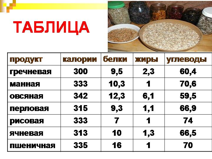 калорийность круп сухого продукта. обычно каша разваривается в 2 раза. например, вы берете 50 гр гречки сухой, вареная она будет уже 100-110 грамм.