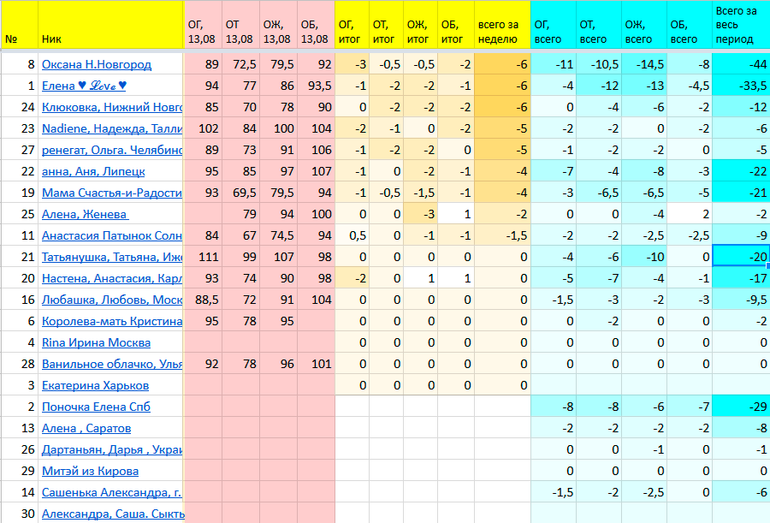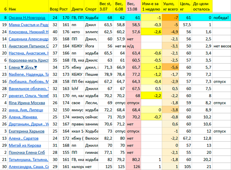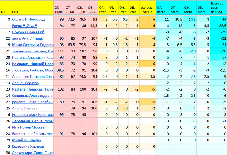 Привет, девчонки ) Извините за отсутствие. Я в строю! Спонтанно уехали на отдых. Даже за четверг не отчиталась, так как собиралась до поздна, а потом все эти дни без не желала растрачивать нервные клетки на ужасный интернет. В общем подробно уже и не отчитаюсь, старалась придерживаться питания, варенные и запеченные курица и овощи, яйца, салаты на постном масле, утром кофе вечером кефир. да, грешила конечно, было пиво с таранкой и пара бутербродов с ветчиной и французским батоном (это первый хлеб за последние пару месяцев)))) на весах утром 70 и побежала на работу. Сейчас сделала замеры и внесла в таблицу. Вот что то с размерами странно... то ли новый сантиметр, то ли отечность... сиськи +1 но висят как тряпочки. живот минус, попа на месте. Отечность чувствую, жара несусветная а я весь день в дороге без кондера. Обручалка давит, ноги как свинцовые...