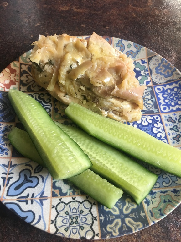 Запекала я курицу (разделать на кусочки, посолить, поперчить, специи и в духовку мин на 45), сверху добавила сметаны и порезала яблоко. (Накрыть фольгой, чтобы не горело и ещё оставить на мин 10). Получилось прям как полноценная курица с яблоками 👍