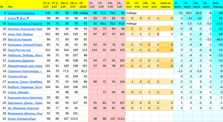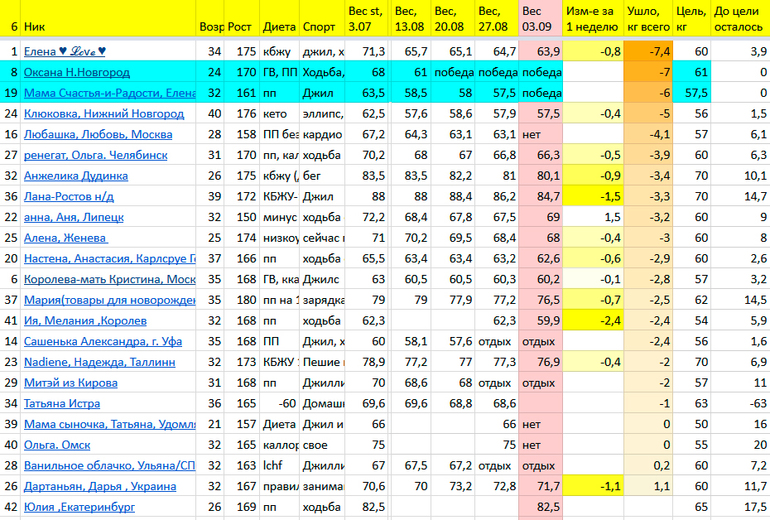 Стройнеем вместе(здесь пишем марафоны,которые уже идут, или предложения о марафоне)Нам сегодня ровно 2 месяца!!! Поздравляю тех кто с нами с самого начала. Вот, что значит сила воли и желание иметь стройное тело. Так держать. Не останавливайтесь на достигнутом. Осталось совсем немного, всего 2 месяца. Мы обязательно справимся. СЕГОДНЯ У НАС ЗАМЕРЫ!!! Отмечаем вес в этой таблице, объемы в этой. У кого не вышло, пишем в комменты.